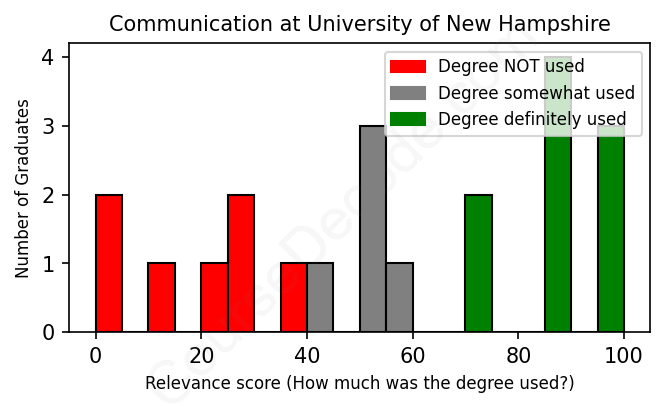 The verdict? Significantly below average. Overall, with an average relevance score of 55%, Communication graduates from University of New Hampshire have a much lower likelihood (-12%) of finding work in this field compared to the average graduate across all fields: