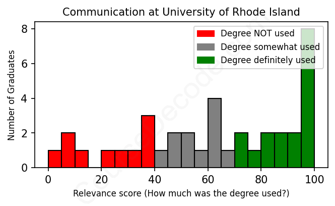 The verdict? Slightly below average. Overall, with an average relevance score of 62%, Communication graduates from University of Rhode Island have a slightly lower likelihood (-5%) of finding work in this field compared to the average graduate across all fields: