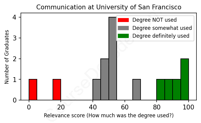 The verdict? Below average. Overall, with an average relevance score of 58%, Communication graduates from University of San Francisco have a lower likelihood (-9%) of finding work in this field compared to the average graduate across all fields: