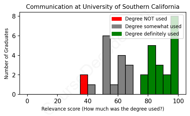 The verdict? Above average. Overall, with an average relevance score of 74%, Communication graduates from University of Southern California have a higher likelihood (+7%) of finding work in this field compared to the average graduate across all fields: