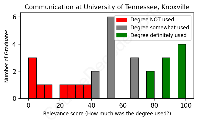 The verdict? Significantly below average. Overall, with an average relevance score of 52%, Communication graduates from University of Tennessee, Knoxville have a much lower likelihood (-15%) of finding work in this field compared to the average graduate across all fields: