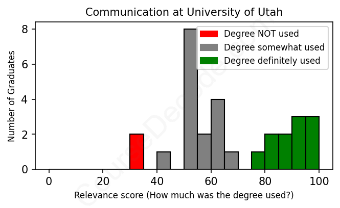 The verdict? Slightly below average. Overall, with an average relevance score of 66%, Communication graduates from University of Utah have a slightly lower likelihood (-1%) of finding work in this field compared to the average graduate across all fields: