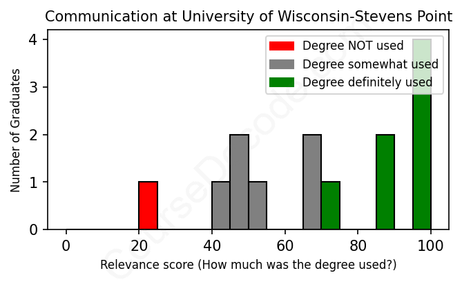The verdict? Slightly above average. Overall, with an average relevance score of 70%, Communication graduates from University of Wisconsin-Stevens Point have a slightly higher likelihood (+3%) of finding work in this field compared to the average graduate across all fields:
