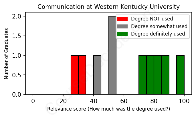 The verdict? Slightly below average. Overall, with an average relevance score of 62%, Communication graduates from Western Kentucky University have a slightly lower likelihood (-5%) of finding work in this field compared to the average graduate across all fields: