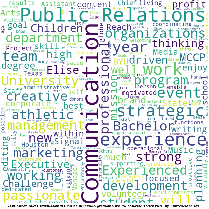Here is a visual representation of the most common words seen in the "about" section of LinkedIn profiles who have a Bachelor degree in Communications-Public Relations. This may or may not be useful: