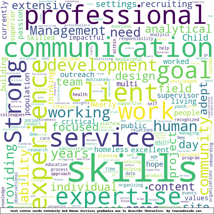 Here is a visual representation of the most common words seen in the "about" section of LinkedIn profiles who have a Bachelor degree in Community And Human Services (this is across all Community And Human Services graduates we've analyzed, not just those who went to State University of New York Empire State College). This may or may not be useful: