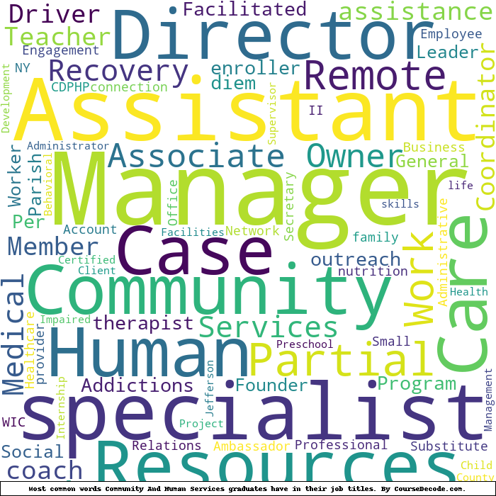 Here is a visual representation of the most common words in job titles for Community And Human Services graduates (this is across all Community And Human Services graduates we've analyzed, not just those who went to State University of New York Empire State College):