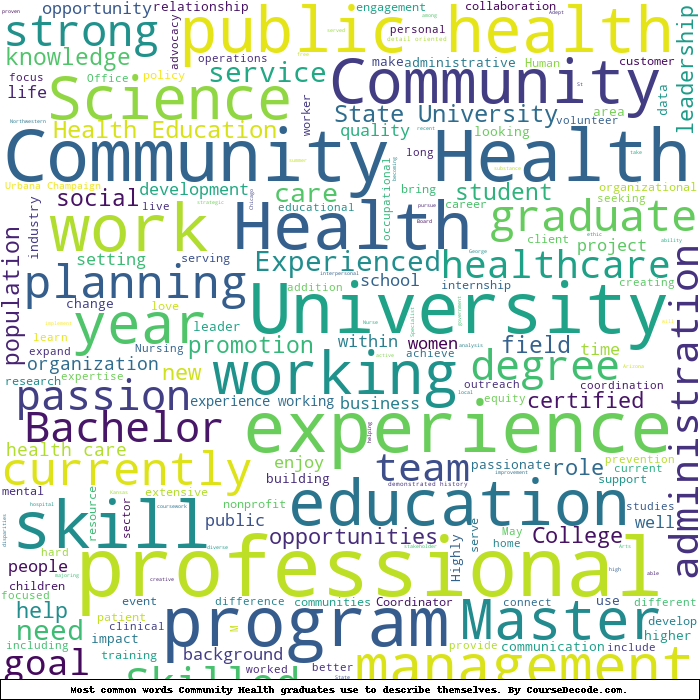 Here is a visual representation of the most common words seen in the "about" section of LinkedIn profiles who have a Bachelor degree in Community Health. This may or may not be useful: