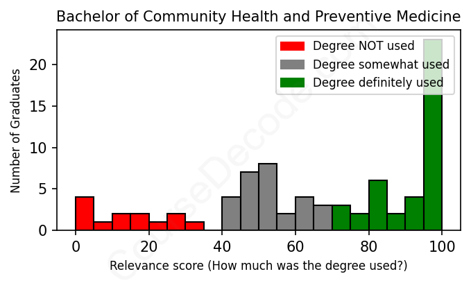The verdict? Slightly below average. Overall, with an average relevance score of 65%, Community Health and Preventive Medicine graduates have a slightly lower likelihood (-2%) of finding work in this field compared to the average graduate across all fields:
