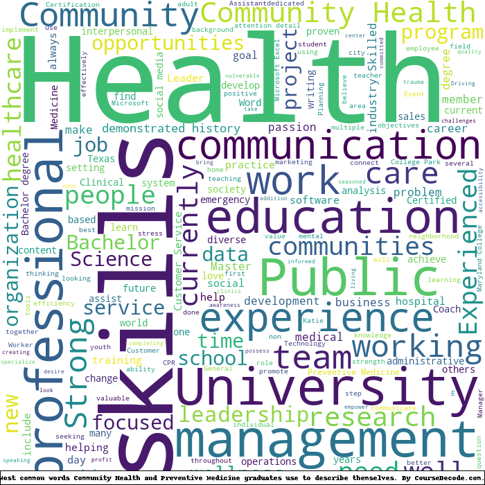 Here is a visual representation of the most common words seen in the "about" section of LinkedIn profiles who have a Bachelor degree in Community Health and Preventive Medicine. This may or may not be useful: