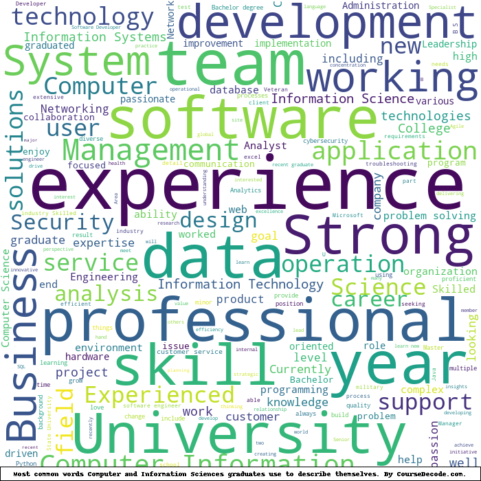 Here is a visual representation of the most common words seen in the "about" section of LinkedIn profiles who have a Bachelor degree in Computer and Information Sciences. This may or may not be useful:
