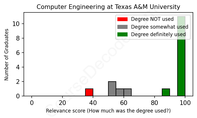 The verdict? Significantly above average. Overall, with an average relevance score of 85%, Computer Engineering graduates from Texas A&M University have a much higher likelihood (+18%) of finding work in this field compared to the average graduate across all fields: