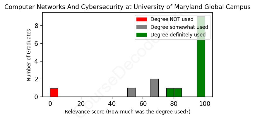 First, some facts. Of the Computer Networks And Cybersecurity graduates from University of Maryland Global Campus we've analyzed , here's how many have used (or NOT used) their degree in their career: