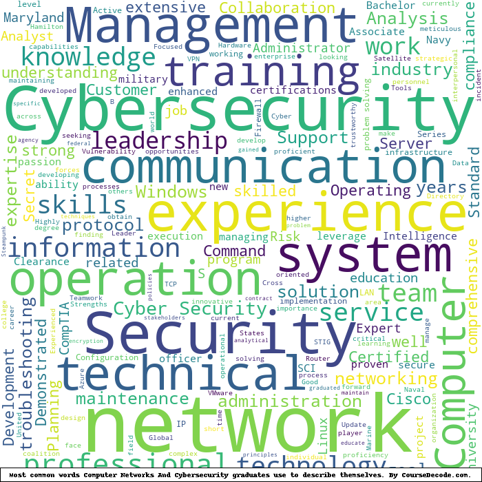 Here is a visual representation of the most common words seen in the "about" section of LinkedIn profiles who have a Bachelor degree in Computer Networks And Cybersecurity (this is across all Computer Networks And Cybersecurity graduates we've analyzed, not just those who went to University of Maryland Global Campus). This may or may not be useful: