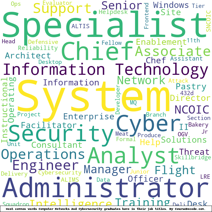 Here is a visual representation of the most common words in job titles for Computer Networks And Cybersecurity graduates (this is across all Computer Networks And Cybersecurity graduates we've analyzed, not just those who went to University of Maryland Global Campus):