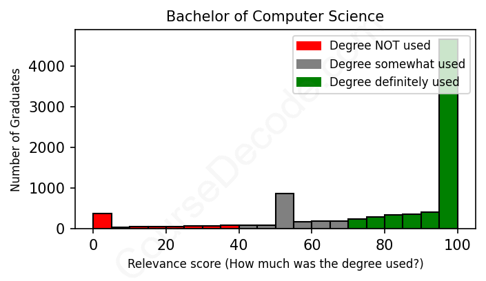 The verdict? Significantly above average. Overall, with an average relevance score of 80%, Computer Science graduates have a much higher likelihood (+13%) of finding work in this field compared to the average graduate across all fields: