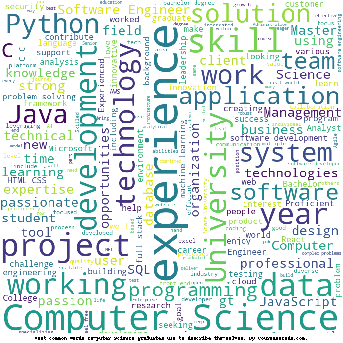 Here is a visual representation of the most common words seen in the "about" section of LinkedIn profiles who have a Bachelor degree in Computer Science. This may or may not be useful: