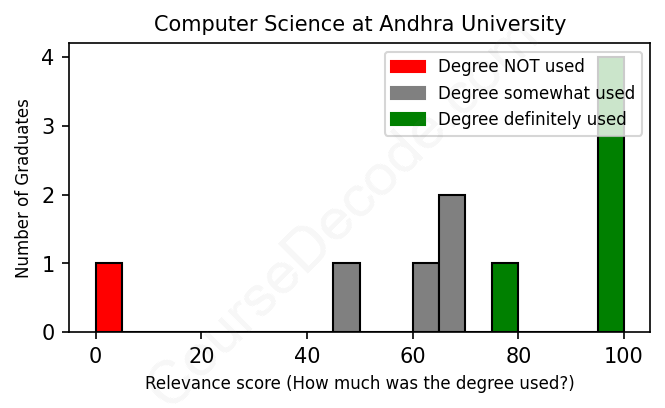 The verdict? Slightly above average. Overall, with an average relevance score of 71%, Computer Science graduates from Andhra University have a slightly higher likelihood (+4%) of finding work in this field compared to the average graduate across all fields: