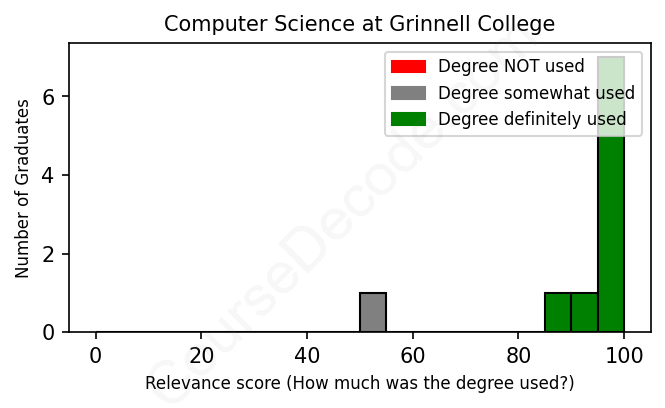 The verdict? Great! Overall, with an average relevance score of 92%, Computer Science graduates from Grinnell College have a substantially higher likelihood (+25%) of finding work in this field compared to the average graduate across all fields: