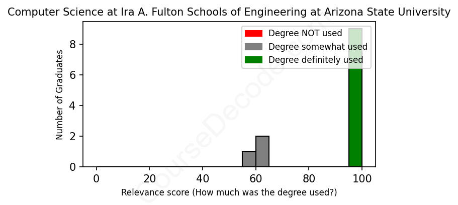 The verdict? Great! Overall, with an average relevance score of 89%, Computer Science graduates from Ira A. Fulton Schools of Engineering at Arizona State University have a substantially higher likelihood (+22%) of finding work in this field compared to the average graduate across all fields:
