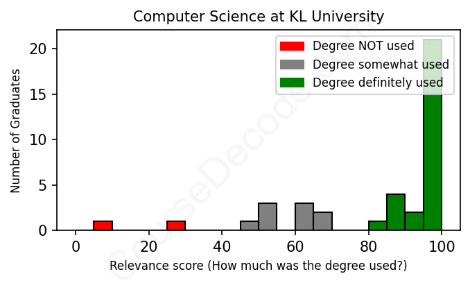The verdict? Significantly above average. Overall, with an average relevance score of 83%, Computer Science graduates from KL University have a much higher likelihood (+16%) of finding work in this field compared to the average graduate across all fields:
