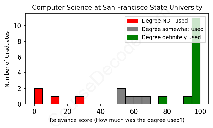 The verdict? Slightly above average. Overall, with an average relevance score of 72%, Computer Science graduates from San Francisco State University have a slightly higher likelihood (+5%) of finding work in this field compared to the average graduate across all fields: