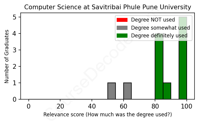 The verdict? Significantly above average. Overall, with an average relevance score of 84%, Computer Science graduates from Savitribai Phule Pune University have a much higher likelihood (+17%) of finding work in this field compared to the average graduate across all fields: