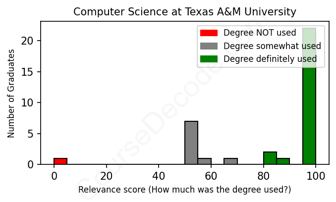 The verdict? Significantly above average. Overall, with an average relevance score of 83%, Computer Science graduates from Texas A&M University have a much higher likelihood (+16%) of finding work in this field compared to the average graduate across all fields: