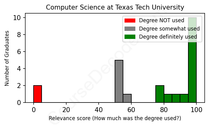 The verdict? Above average. Overall, with an average relevance score of 74%, Computer Science graduates from Texas Tech University have a higher likelihood (+7%) of finding work in this field compared to the average graduate across all fields: