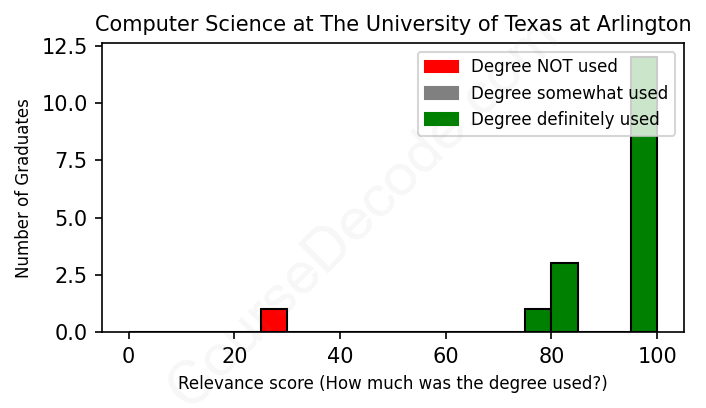 The verdict? Great! Overall, with an average relevance score of 91%, Computer Science graduates from The University of Texas at Arlington have a substantially higher likelihood (+24%) of finding work in this field compared to the average graduate across all fields: