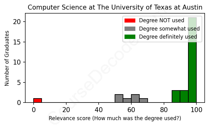 The verdict? Significantly above average. Overall, with an average relevance score of 87%, Computer Science graduates from The University of Texas at Austin have a much higher likelihood (+20%) of finding work in this field compared to the average graduate across all fields: