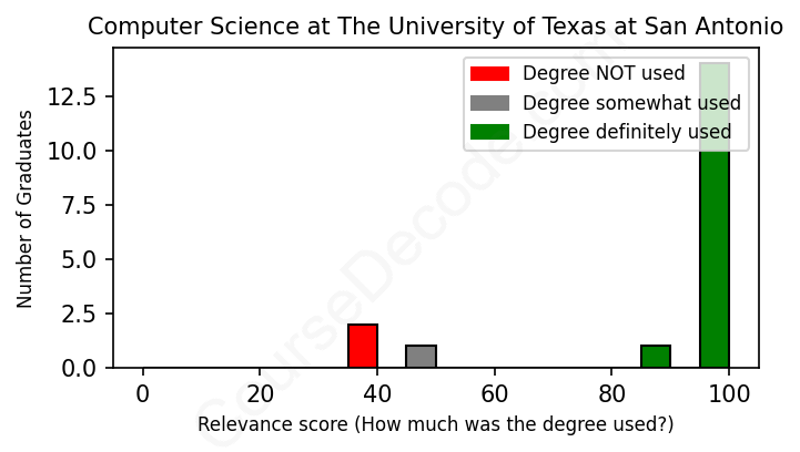 The verdict? Great! Overall, with an average relevance score of 88%, Computer Science graduates from The University of Texas at San Antonio have a substantially higher likelihood (+21%) of finding work in this field compared to the average graduate across all fields: