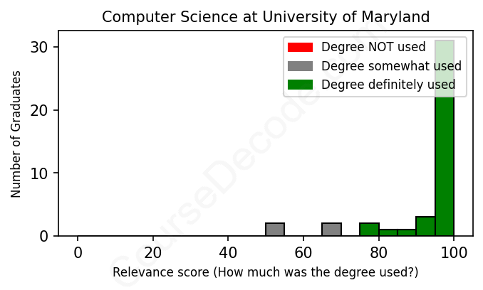 The verdict? Great! Overall, with an average relevance score of 93%, Computer Science graduates from University of Maryland have a substantially higher likelihood (+26%) of finding work in this field compared to the average graduate across all fields: