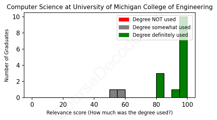 The verdict? Great! Overall, with an average relevance score of 90%, Computer Science graduates from University of Michigan College of Engineering have a substantially higher likelihood (+23%) of finding work in this field compared to the average graduate across all fields: