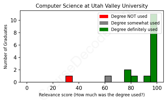 The verdict? Great! Overall, with an average relevance score of 89%, Computer Science graduates from Utah Valley University have a substantially higher likelihood (+22%) of finding work in this field compared to the average graduate across all fields: