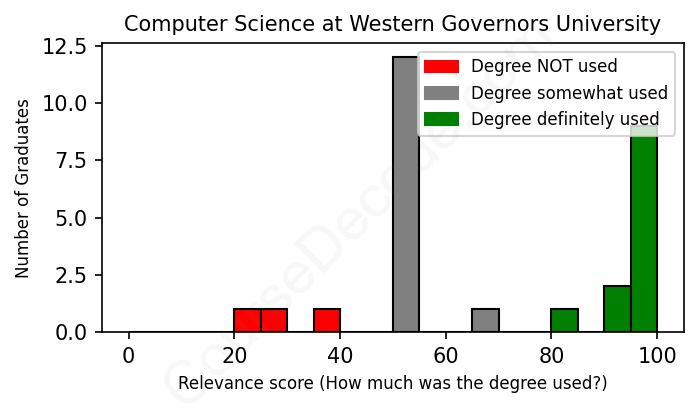 The verdict? Slightly above average. Overall, with an average relevance score of 68%, Computer Science graduates from Western Governors University have a slightly higher likelihood (+1%) of finding work in this field compared to the average graduate across all fields: