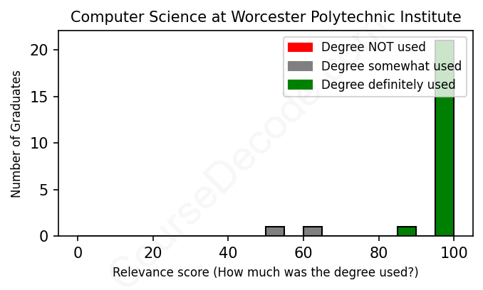 The verdict? Great! Overall, with an average relevance score of 95%, Computer Science graduates from Worcester Polytechnic Institute have a substantially higher likelihood (+28%) of finding work in this field compared to the average graduate across all fields:
