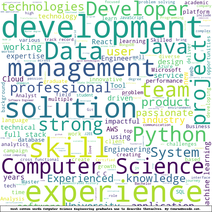 Here is a visual representation of the most common words seen in the "about" section of LinkedIn profiles who have a Bachelor degree in Computer Science Engineering. This may or may not be useful: