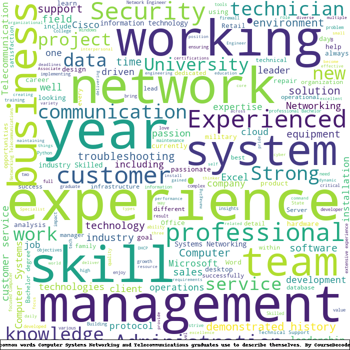 Here is a visual representation of the most common words seen in the "about" section of LinkedIn profiles who have a Bachelor degree in Computer Systems Networking and Telecommunications. This may or may not be useful: