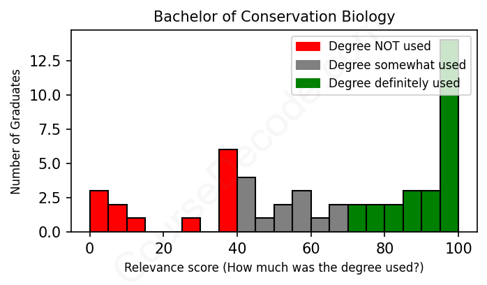 The verdict? Slightly below average. Overall, with an average relevance score of 64%, Conservation Biology graduates have a slightly lower likelihood (-3%) of finding work in this field compared to the average graduate across all fields: