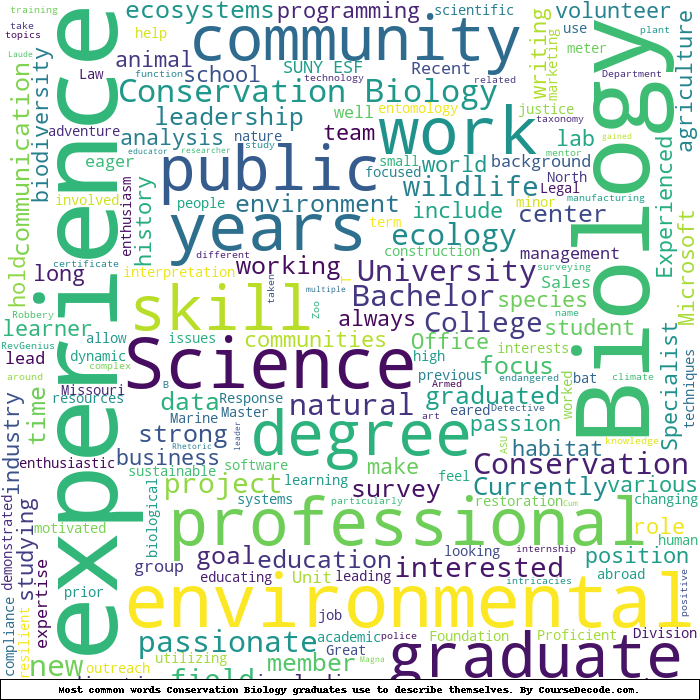 Here is a visual representation of the most common words seen in the "about" section of LinkedIn profiles who have a Bachelor degree in Conservation Biology. This may or may not be useful:
