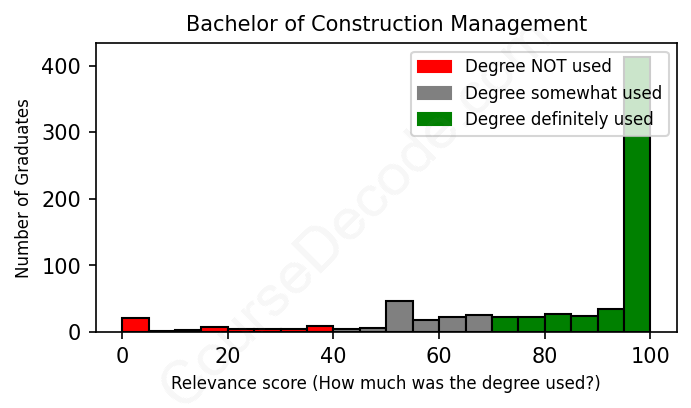 The verdict? Significantly above average. Overall, with an average relevance score of 82%, Construction Management graduates have a much higher likelihood (+15%) of finding work in this field compared to the average graduate across all fields: