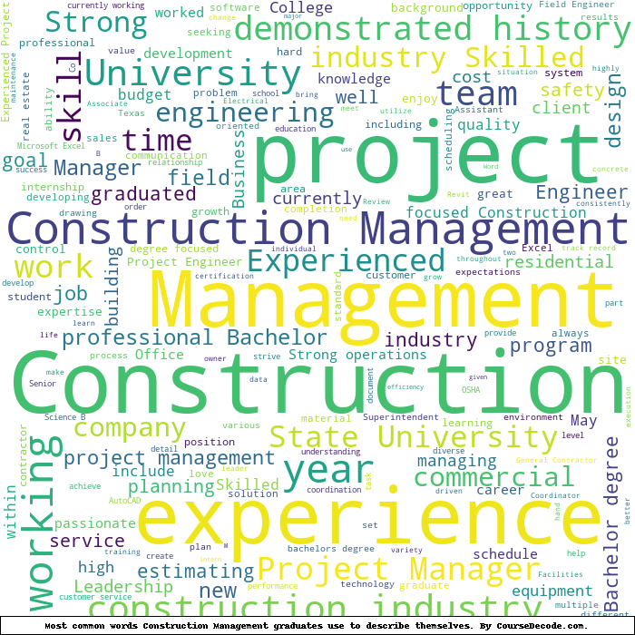 Here is a visual representation of the most common words seen in the "about" section of LinkedIn profiles who have a Bachelor degree in Construction Management. This may or may not be useful: