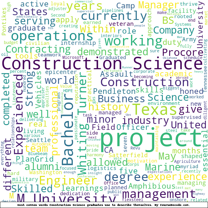 Here is a visual representation of the most common words seen in the "about" section of LinkedIn profiles who have a Bachelor degree in Construction Science (this is across all Construction Science graduates we've analyzed, not just those who went to Texas A&M University). This may or may not be useful: