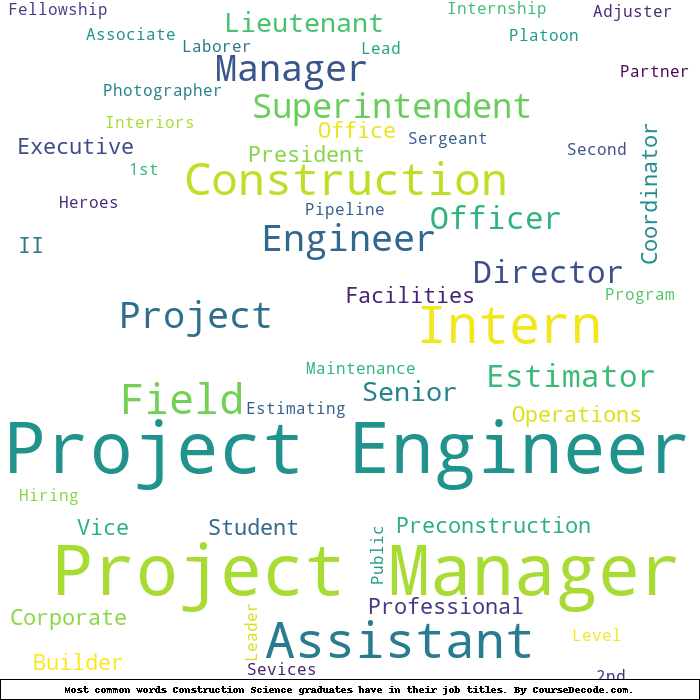Here is a visual representation of the most common words in job titles for Construction Science graduates (this is across all Construction Science graduates we've analyzed, not just those who went to Texas A&M University):