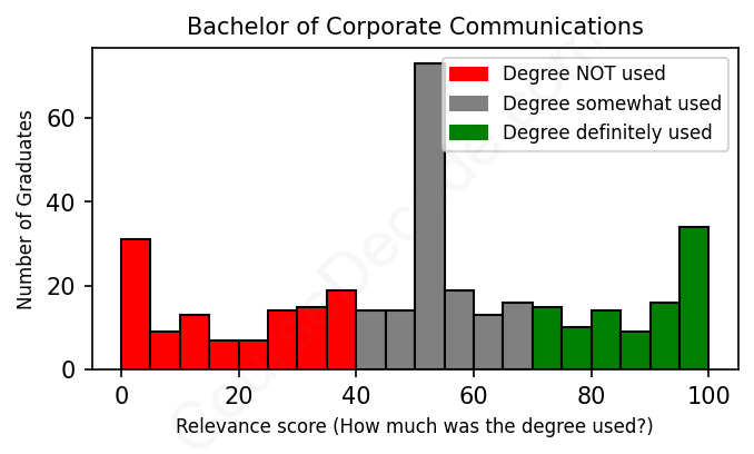 The verdict? Significantly below average. Overall, with an average relevance score of 51%, Corporate Communications graduates have a much lower likelihood (-16%) of finding work in this field compared to the average graduate across all fields: