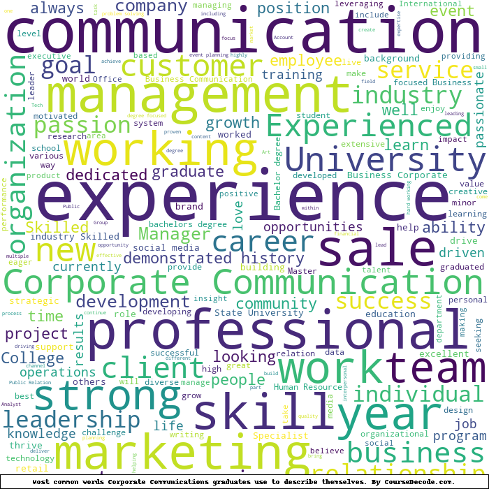 Here is a visual representation of the most common words seen in the "about" section of LinkedIn profiles who have a Bachelor degree in Corporate Communications. This may or may not be useful: