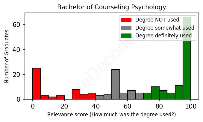 The verdict? Slightly below average. Overall, with an average relevance score of 63%, Counseling Psychology graduates have a slightly lower likelihood (-4%) of finding work in this field compared to the average graduate across all fields:
