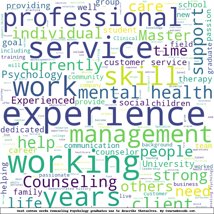 Here is a visual representation of the most common words seen in the "about" section of LinkedIn profiles who have a Bachelor degree in Counseling Psychology. This may or may not be useful:
