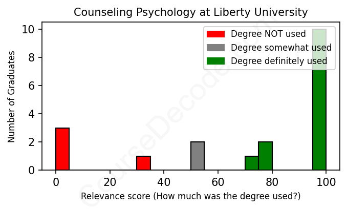 The verdict? Slightly above average. Overall, with an average relevance score of 71%, Counseling Psychology graduates from Liberty University have a slightly higher likelihood (+4%) of finding work in this field compared to the average graduate across all fields: